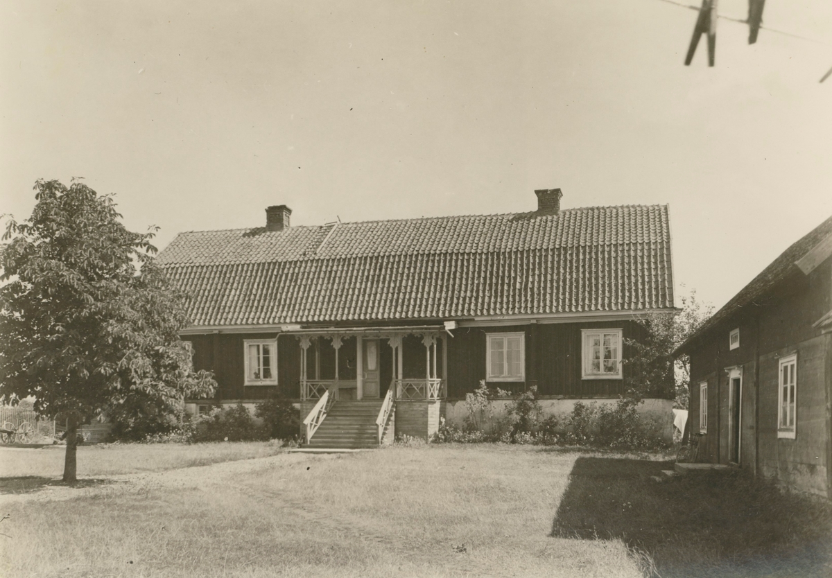 En gård med bostadshus med mansardtak och en ekonomibyggnad.