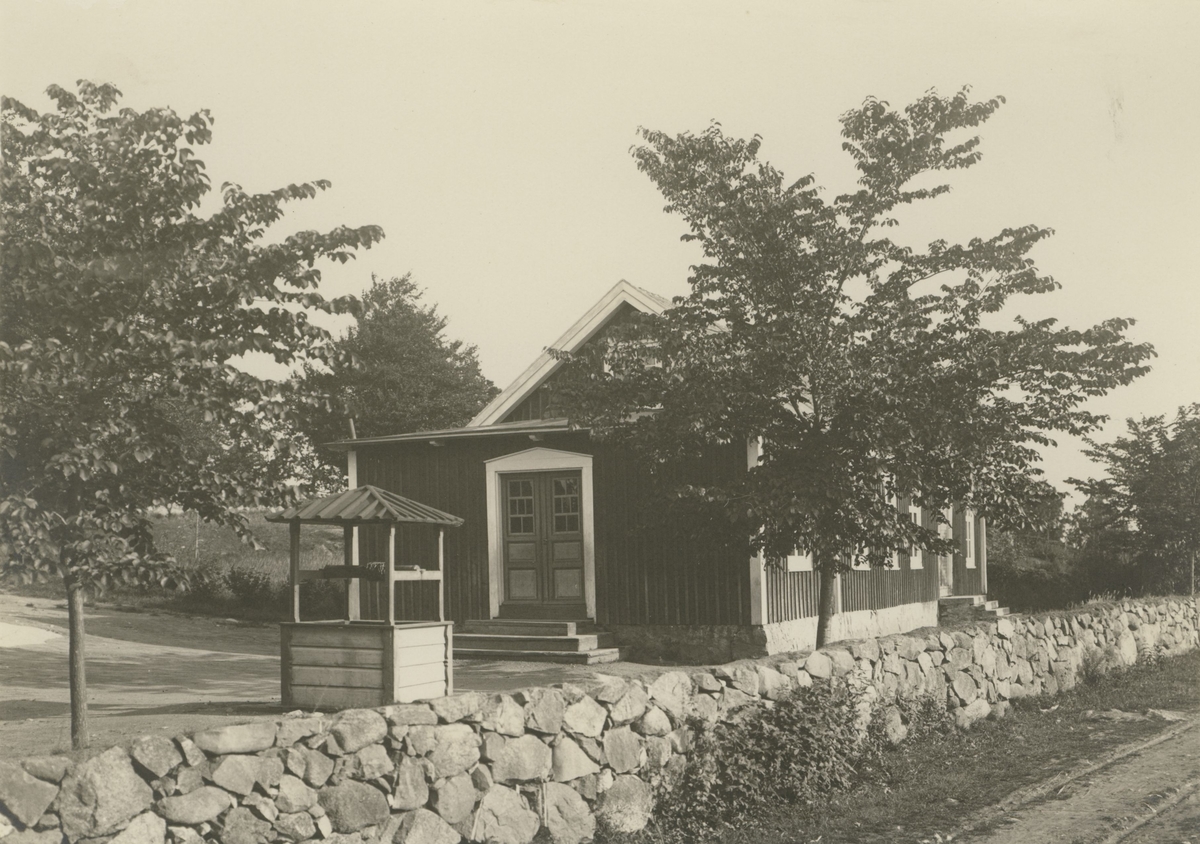 En brunn, stenmur och en skolbyggnad i Slätafly.