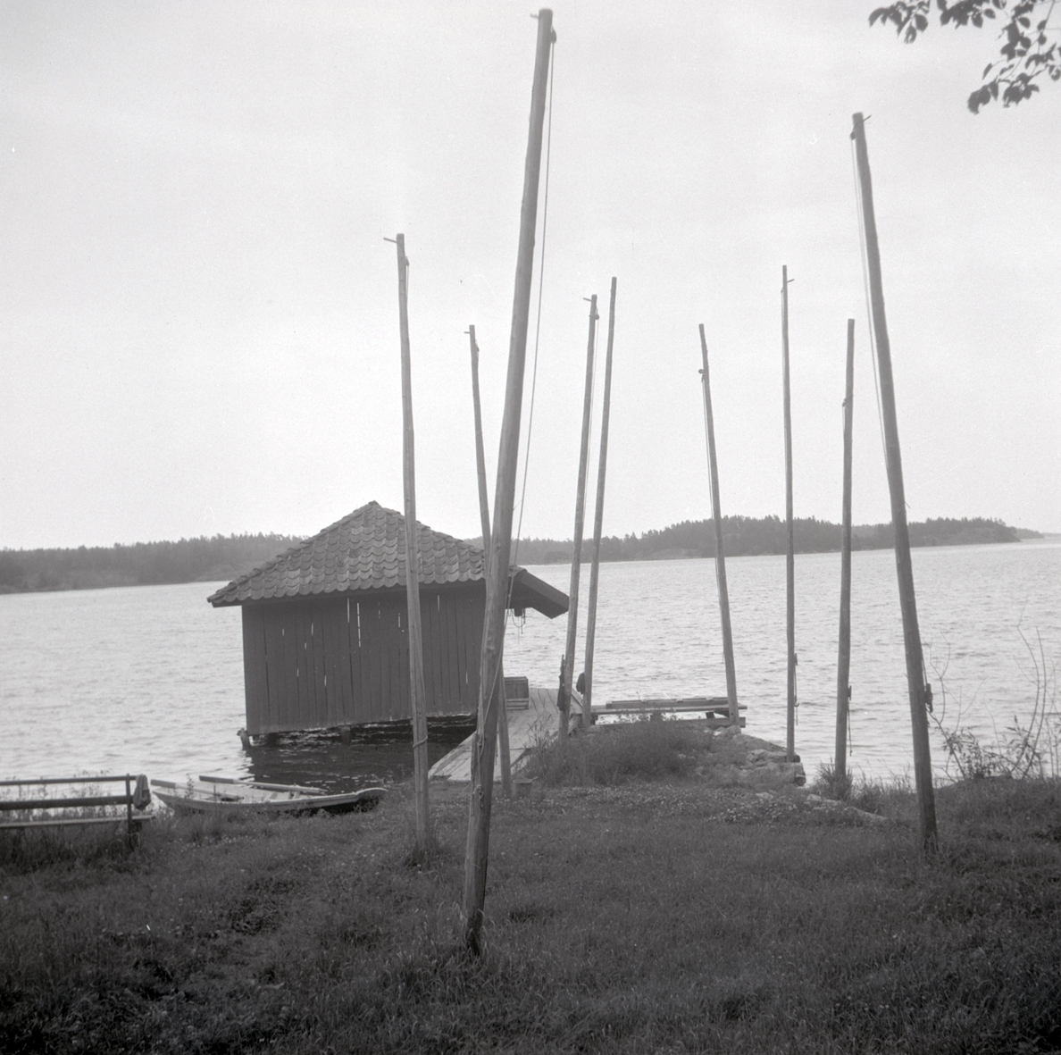 Hamnen i Dagsbo gård. Bild på en brygga med ett båthus.