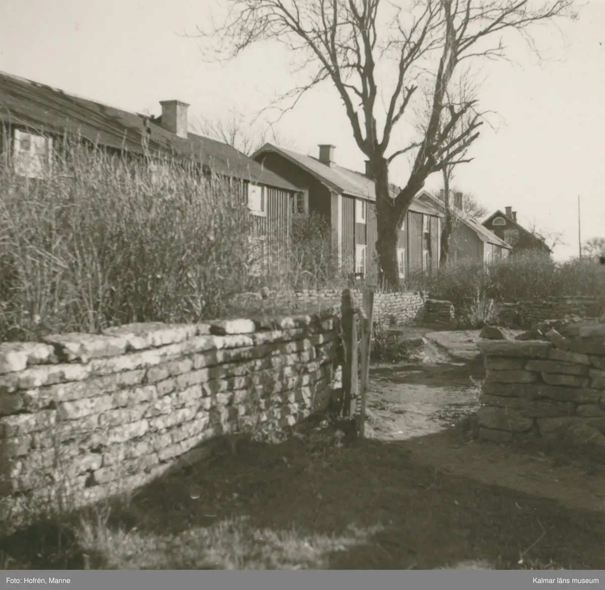 Bostadshus och en stenmur.