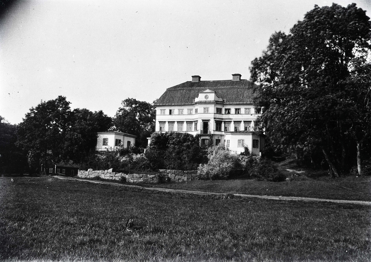 Huvudbyggnaden på Helgerum, sedd från trädgårdssidan, snett från höger.