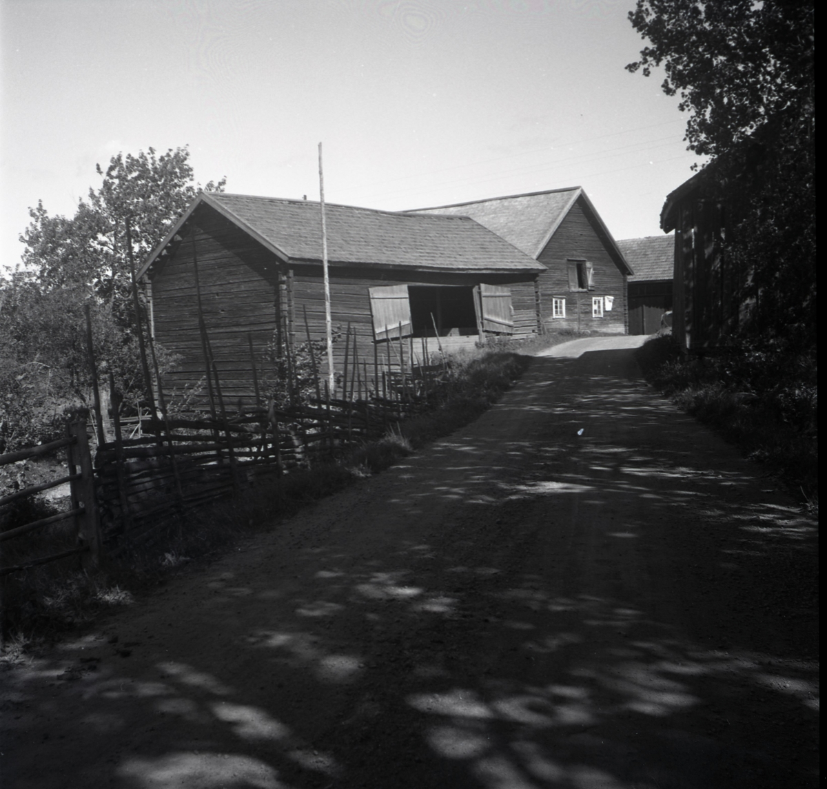 Gärdsgård och ekonomibyggnad med korsknutar.