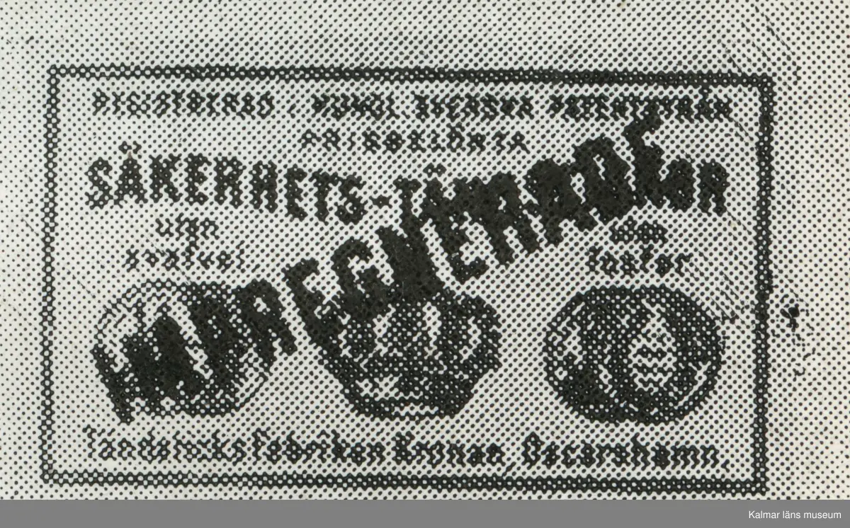 Tändsticksetikett från Tändsticksfabriken kronan i Oskarshamn, "Impregnerade säkerhetständstickor"