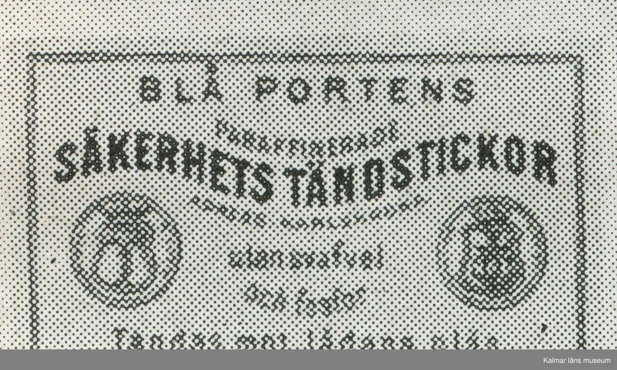 Tändsticksetikett från Oskarshamns Tändsticksfabrik,"Blå Portens Säkerhets-Tändstickor"