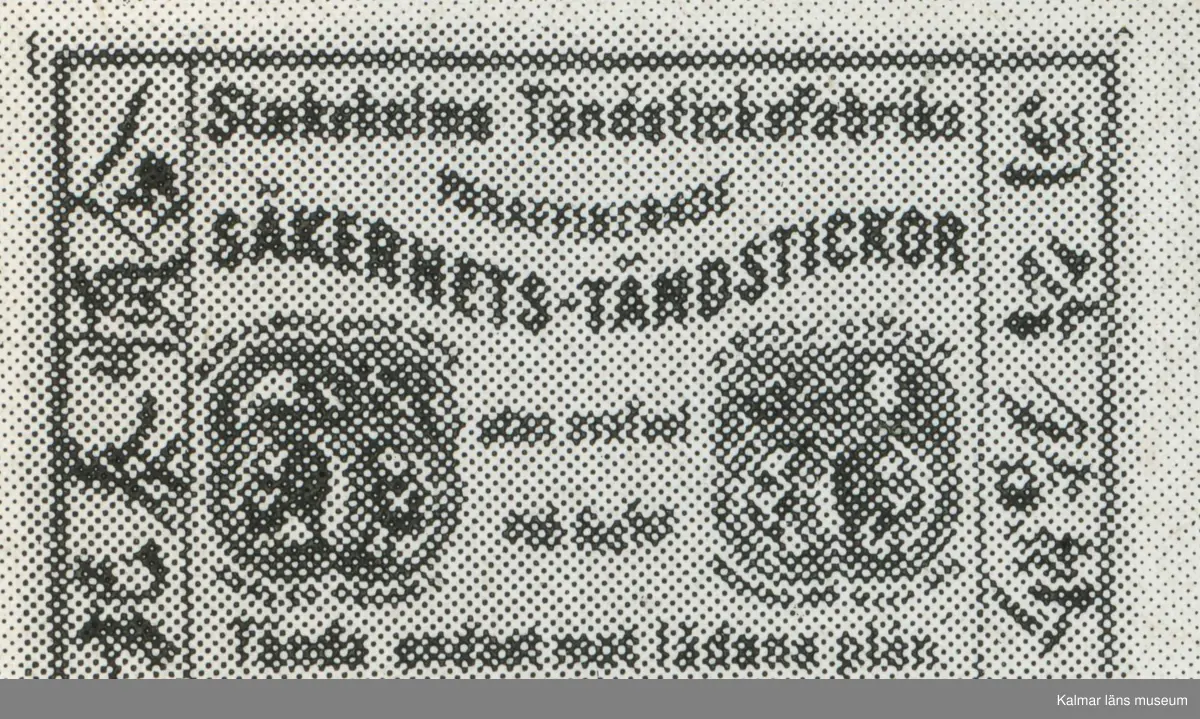 Tändsticksetikett från Stockholms tändsticksfabrik, "Paraffinerade Säkerhets-tändstickor"