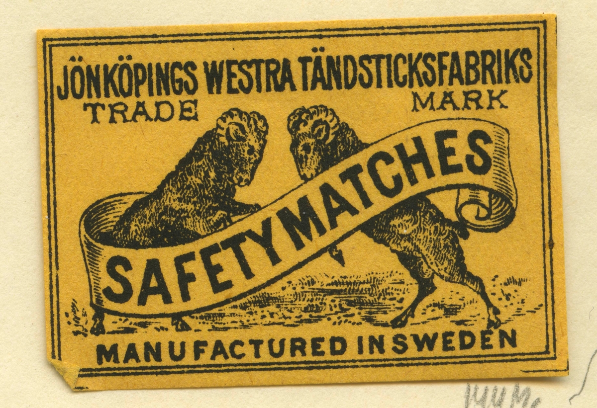 Tändsticksetikett från Jönköpings tändsticksfabrik, "Jönköpings Westra Tändsticksfabriks Safety matches."
