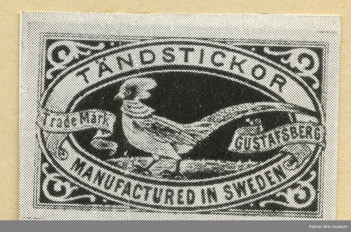 Tändsticksetikett från Gustafsbergs Tändsticksfabrik, "Tändstockor Manufactured in Sweden"