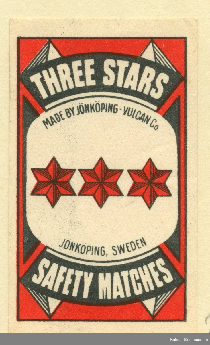 Titel: Tändsticksetikett från Mönsterås Tändsticksfabrik, "Three Stars Safety Matches" Mönsterås har haft två tändsticksfabriker. Den första var Rosendahlsfabriken som anlades 1869 av apotekare Götvid Frykman (1811-1876). Frykman bodde i Kalmar och innehade apoteket i Borgholm 1842-1864. Fabriken lades ner 1887 men 1892 anlades en ny fabrik av Ernst Kreuger och hans bror Fredrik i London under firma E & F Kreuger i Kalmar. Detta skulle bli inledningen till Kreugerepoken inom den svenska tändsticksindustrin.. Under 1800-talet tillverkades vid fabrikerna i huvudsak svaveltändstickor för export. Genom att också fosfor ingick i tändsatsen var de lättantändliga och orsakade ofta små bränder inom fabriken. Stickornas isättning i ramar gjordes för hand och var hälsovådlig för arbetarna, varför de måste passera vakten till tvättrummet som såg till att alla tvättade händerna före måltid och vid arbetets slut. Fosforångorna var också mycket skadliga särkilt för personer med dåliga tänder. Frykman som ägde Rosendahlsfabriken, sålde den till A M Lindqvist från Mönsterås. Lindqvist utökade rörelsen avsevärt, men tillverkningen omfattade bara fosfortändstickor. Mönsterås Tidning skriver i en artikel 1882 att fabriken hade 120 anställda och att priserna låg under Jönköpings. Efter konkursen 1887 lades fabriken ner. (Uppgifterna hämtade från http://thoresmatches.se/tandsticksfabriker/monsteras_tandsticksfabriker.htm)