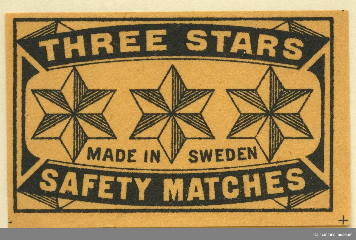 Tändsticksetikett från Mönsterås Tändsticksfabrik, "Three stars Safety Matches"