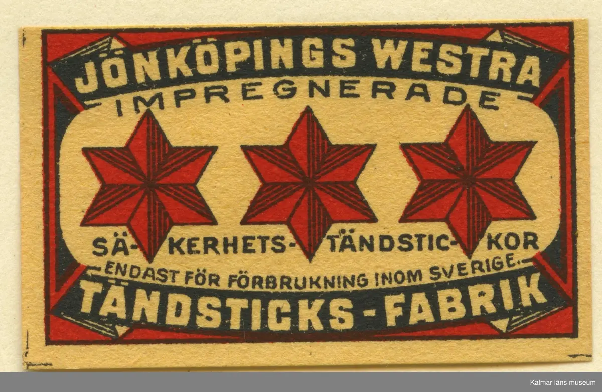 Tändsticksetikett från Mönsterås Tändsticksfabrik, "Jönköpings Westra Tändsticks-fabrik, impregnerade säkerhets-tändstickor"