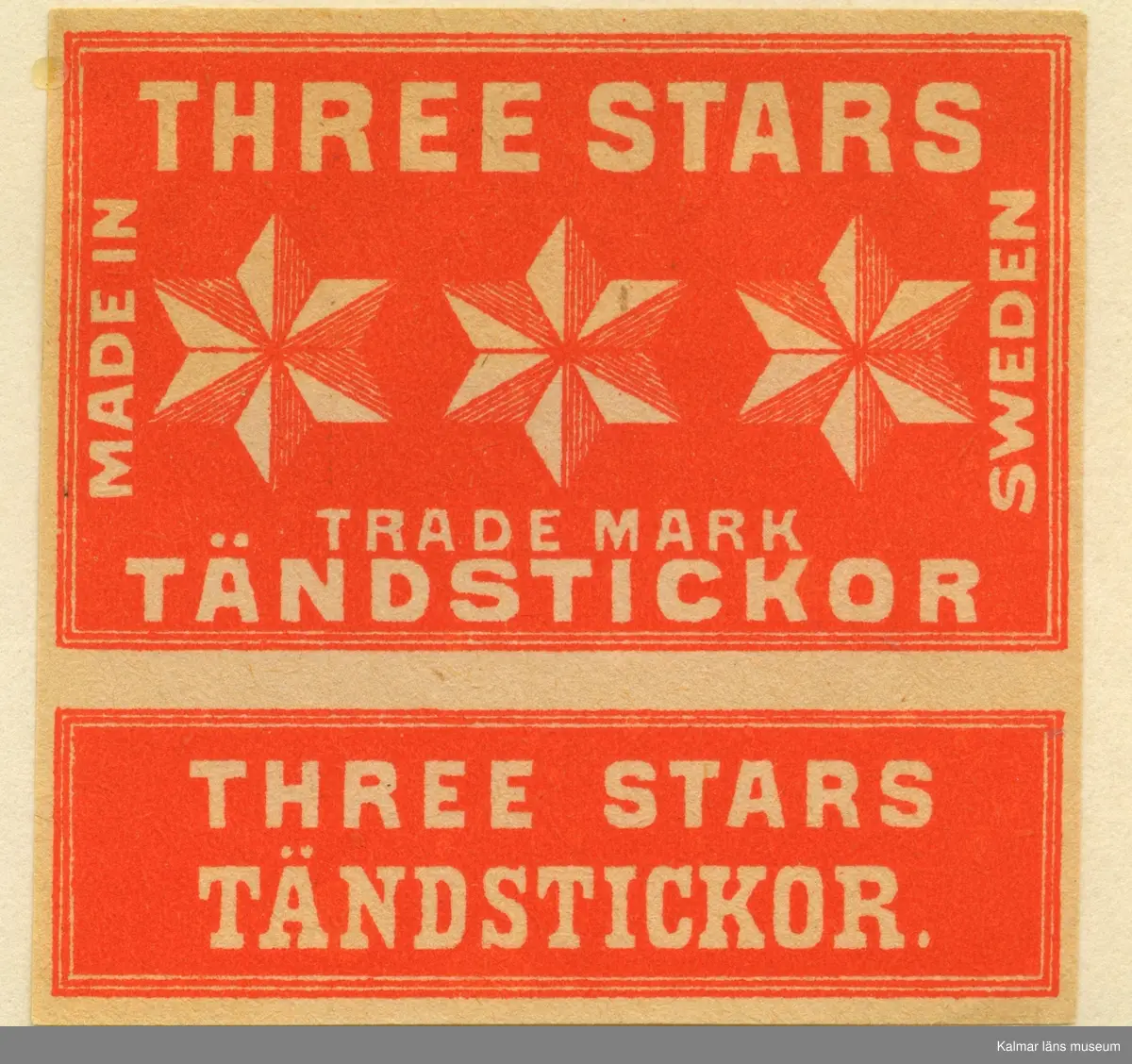 Tändsticksetikett från Mönsterås Tändsticksfabrik, "Three Stars Trade Mark Tändstickor"