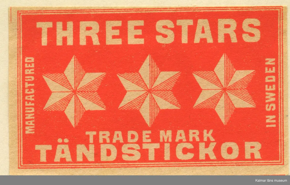 Tändsticksetikett från Mönsterås Tändsticksfabrik, "Three Stars Trade Mark Tändstickor"