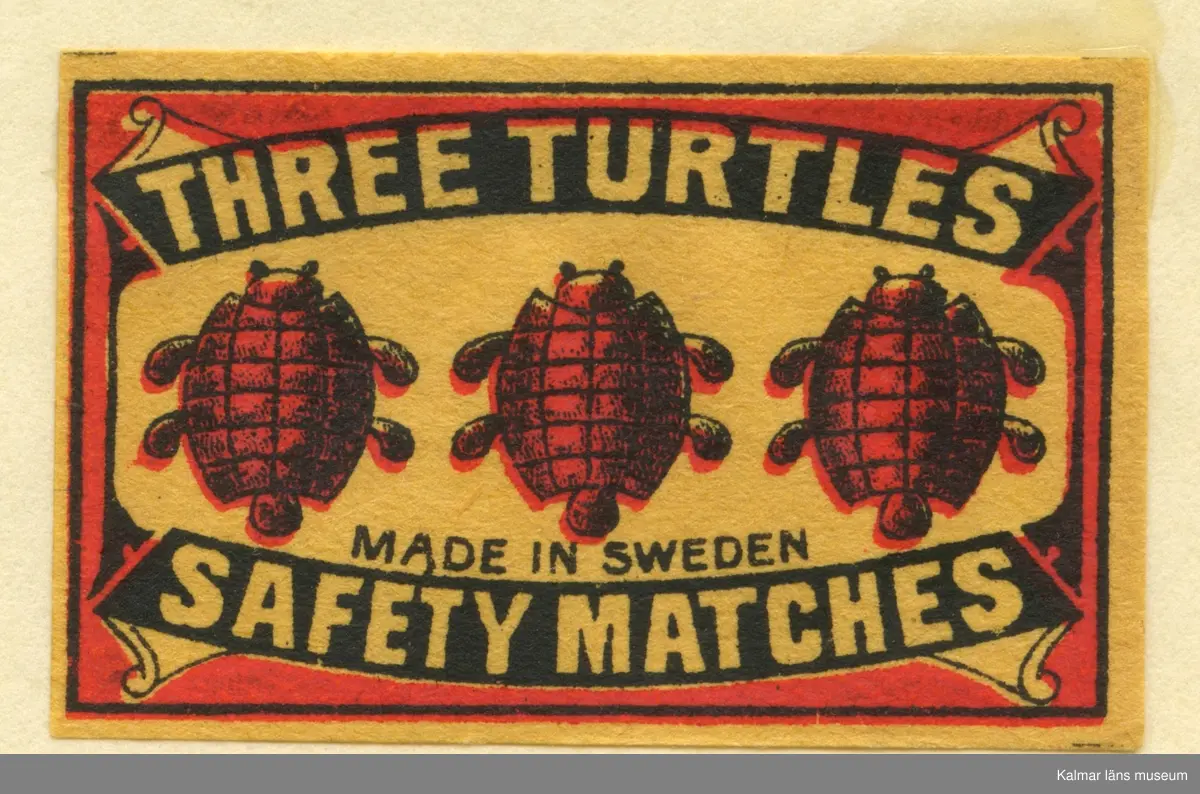Tändsticksetikett från Mönsterås Tändsticksfabrik, "Three Turtles Safety Matches"