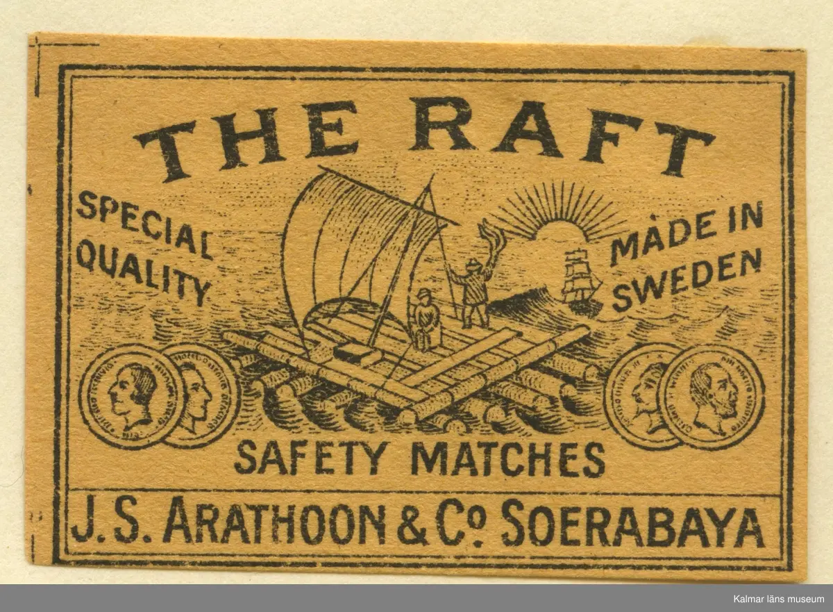 Tändsticksetikett från Mönsterås Tändsticksfabrik, "The Raft Safety Matches, J.S. Arathoon & Co. Soerabaya"