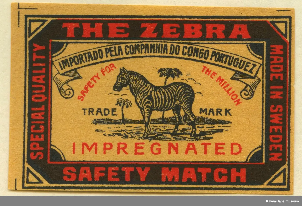 Tändsticksetikett från Mönsterås Tändsticksfabrik, "The Zebra Safety Match", "Importado pela companhia do Congo Portuguez" (Congo Portuguez, eller Portugisiska Kongo, som numera heter Kabinda, är en provins i Angola)