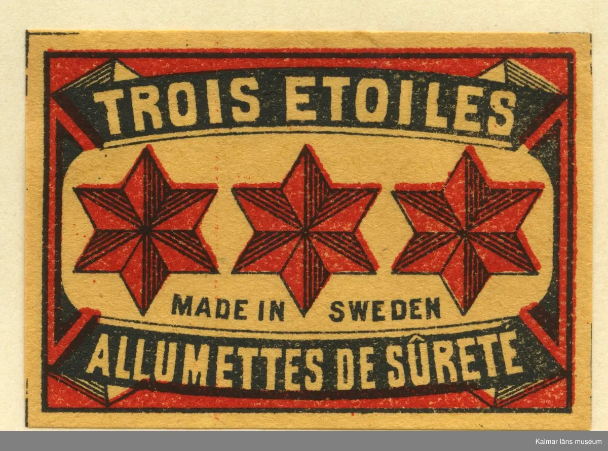 Titel: Tändsticksetikett från Mönsterås Tändsticksfabrik, "Trois Etoiles Allumettes de sûreté"