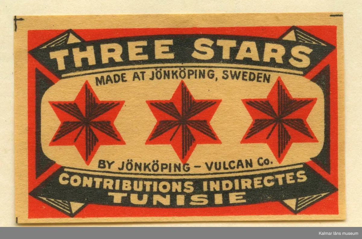 Tändsticksetikett från Mönsterås Tändsticksfabrik, "Three stars Tunisie"."