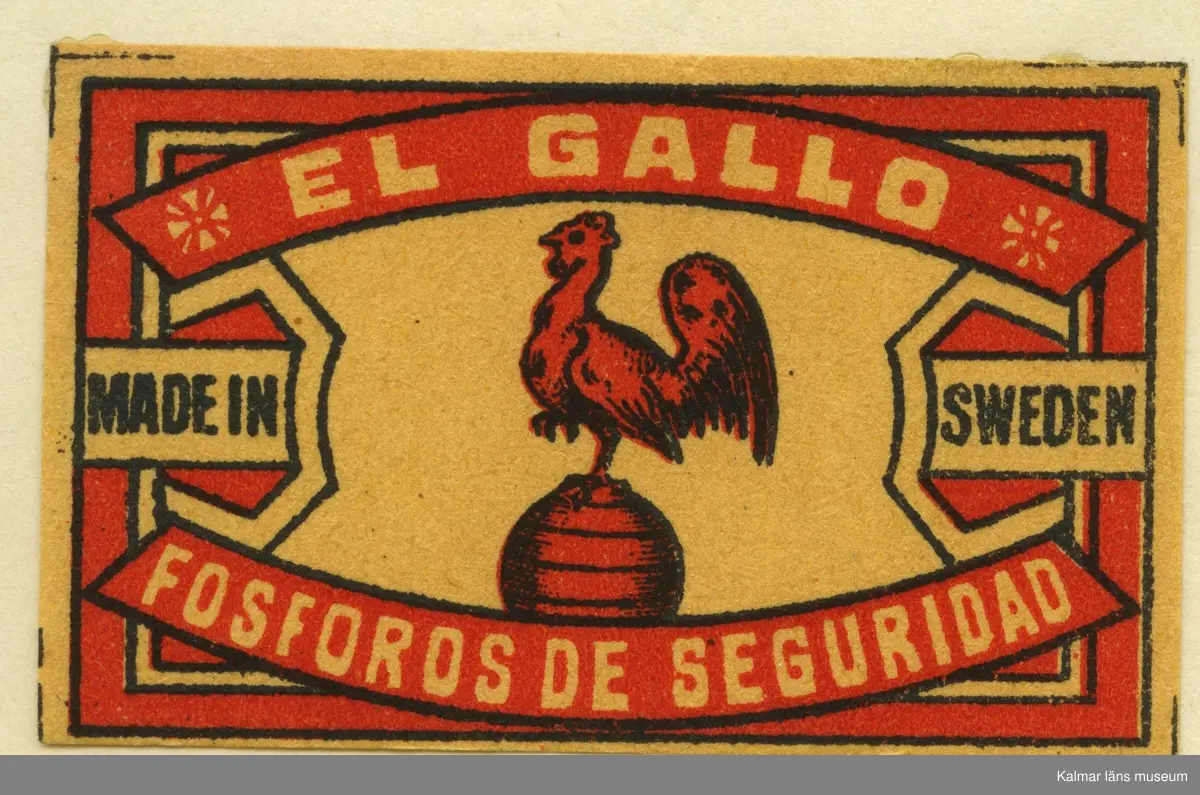 Tändsticksetikett från Mönsterås Tändsticksfabrik, "El Gallo Fosforos de Seguridao"