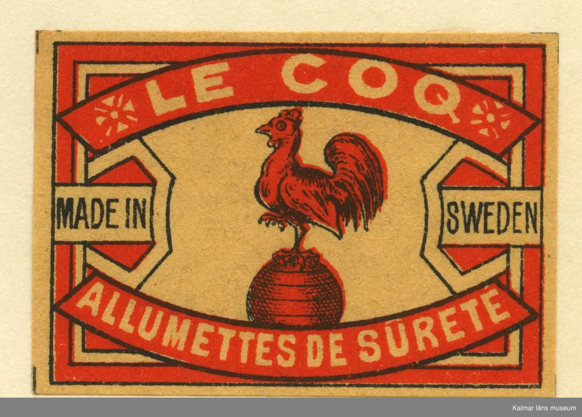 Tändsticksetikett från Mönsterås Tändsticksfabrik, "Le Coq Allumettes de sureté"