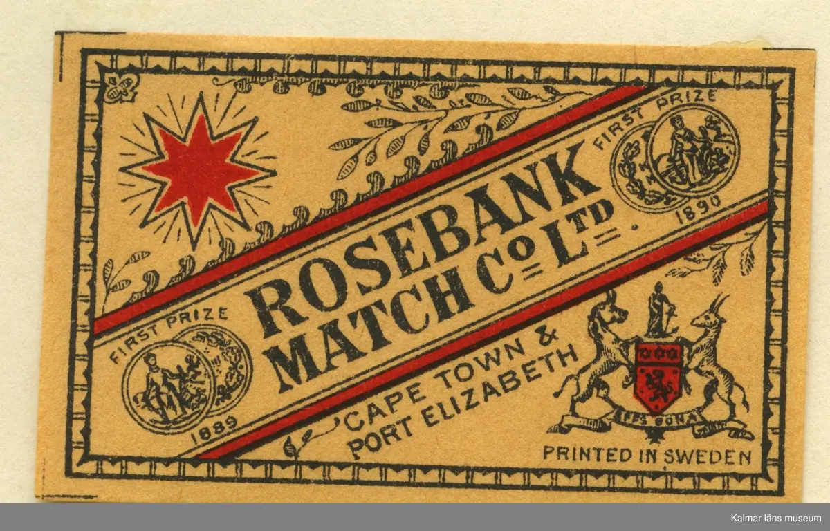 Tändsticksetikett från Mönsterås Tändsticksfabrik, "Rosebank Match Co Ltd. Cape town & Port Elizabeth."