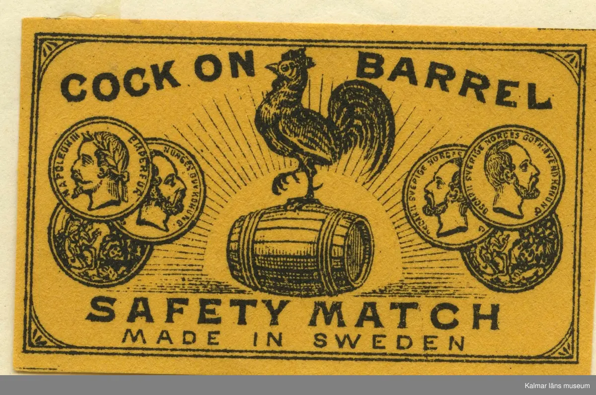 Tändsticksetikett från Mönsterås Tändsticksfabrik, "Cock on Barrel Safety Match."
