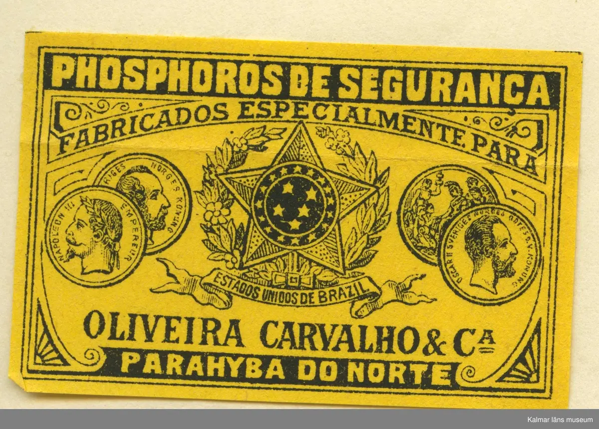 Tändsticksetikett från Mönsterås Tändsticksfabrik, "Phosphoros de seguranca, fabricados especialmente para, Oliviera Arvalho & Ca, Parahyba do norte"