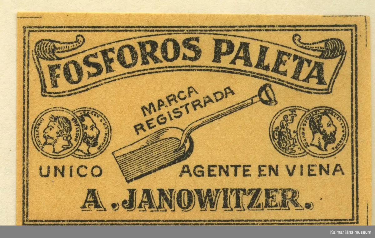 Tändsticksetikett från Mönsterås Tändsticksfabrik, "Fosforos Paleta, Agente en Viena A Janowitzer"