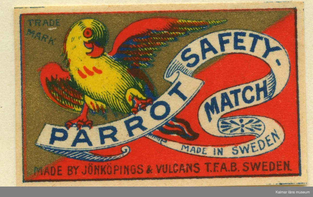 Tändsticksetikett från Mönsterås Tändsticksfabrik, "Parrot Safety Match"