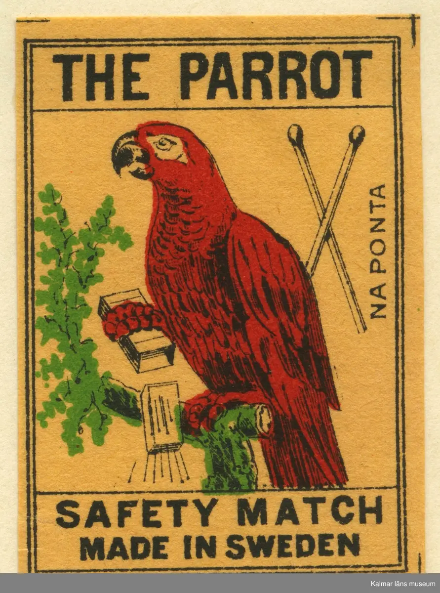 Tändsticksetikett från Mönsterås Tändsticksfabrik, "The Parrot Safety Match"
