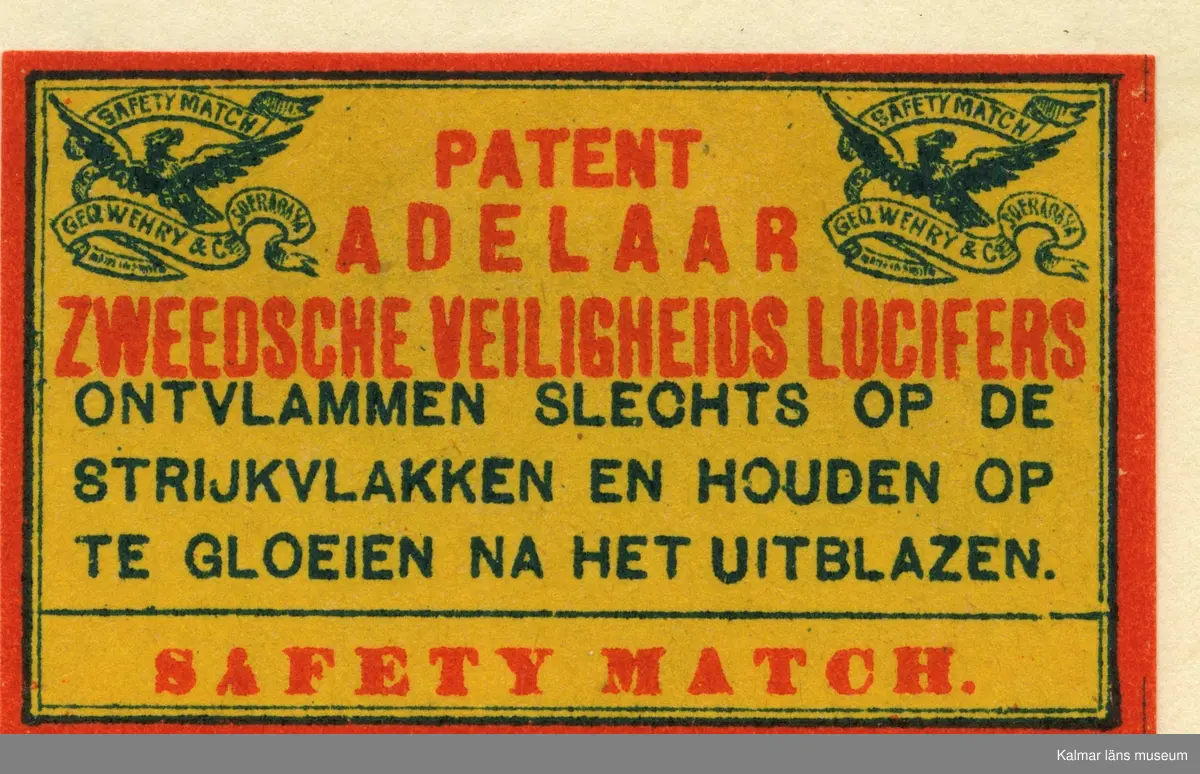 Tändsticksetikett från Mönsterås Tändsticksfabrik, "Patent Adelaar Zweedsche veiligheids lusifers"