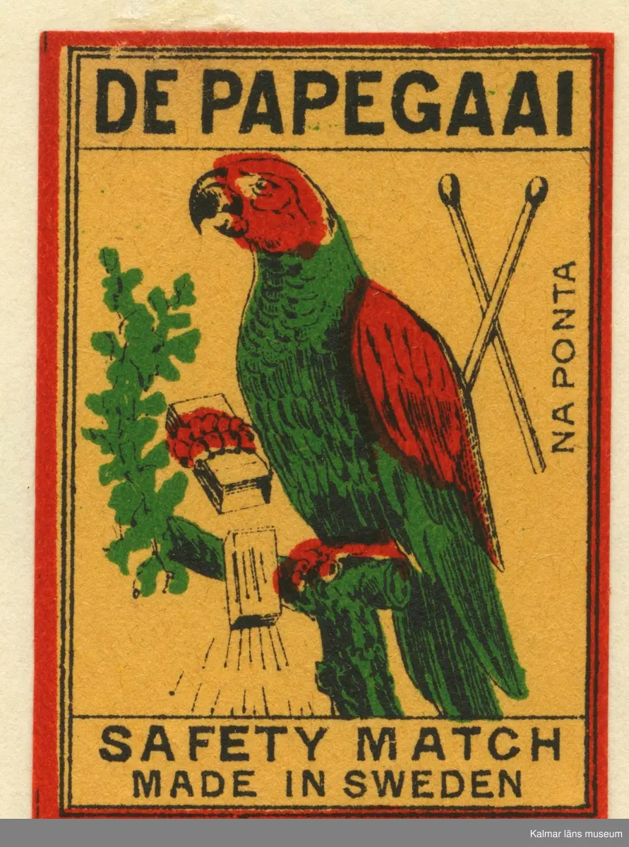 Tändsticksetikett från Mönsterås Tändsticksfabrik, "De Papegaai"