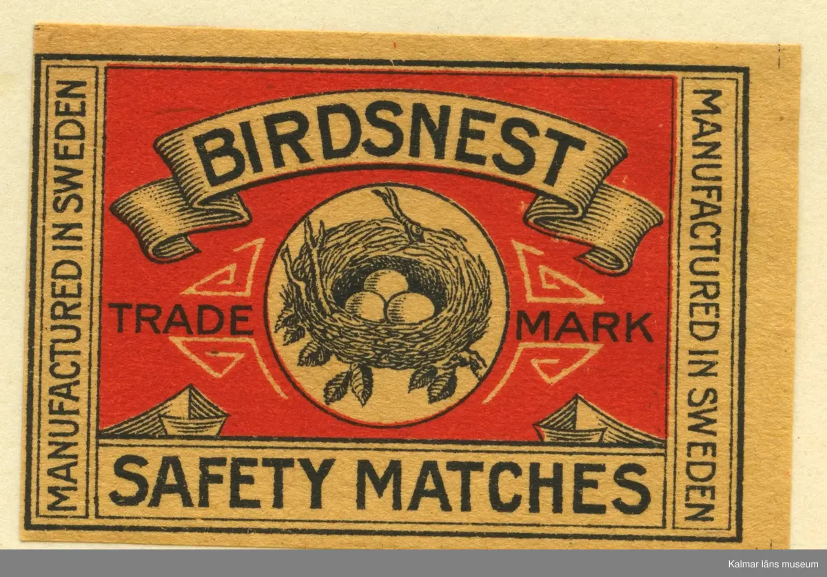 Tändsticksetikett från Mönsterås Tändsticksfabrik, "Birdsnest Safety Matches"