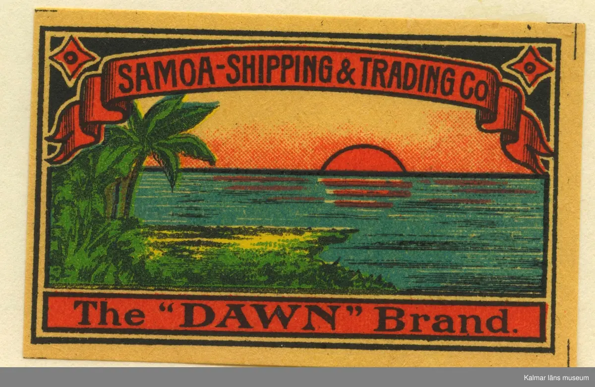 Tändsticksetikett från Mönsterås Tändsticksfabrik, "Samoa Shipping & Trading Co. The Dawn Brand"