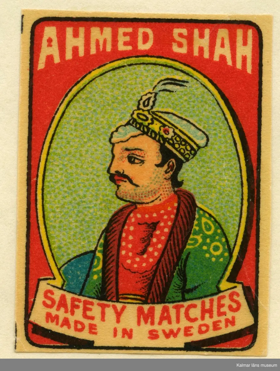 Tändsticksetikett från Mönsterås Tändsticksfabrik, "Ahmed Shah"