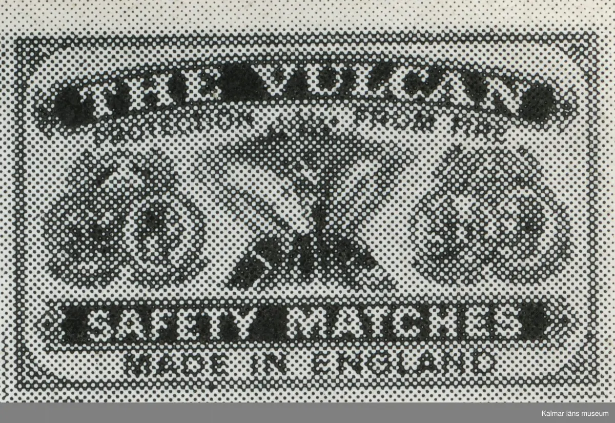 Tändsticksetikett från England, "The Vulcan Assurance Safety Matches made in England."