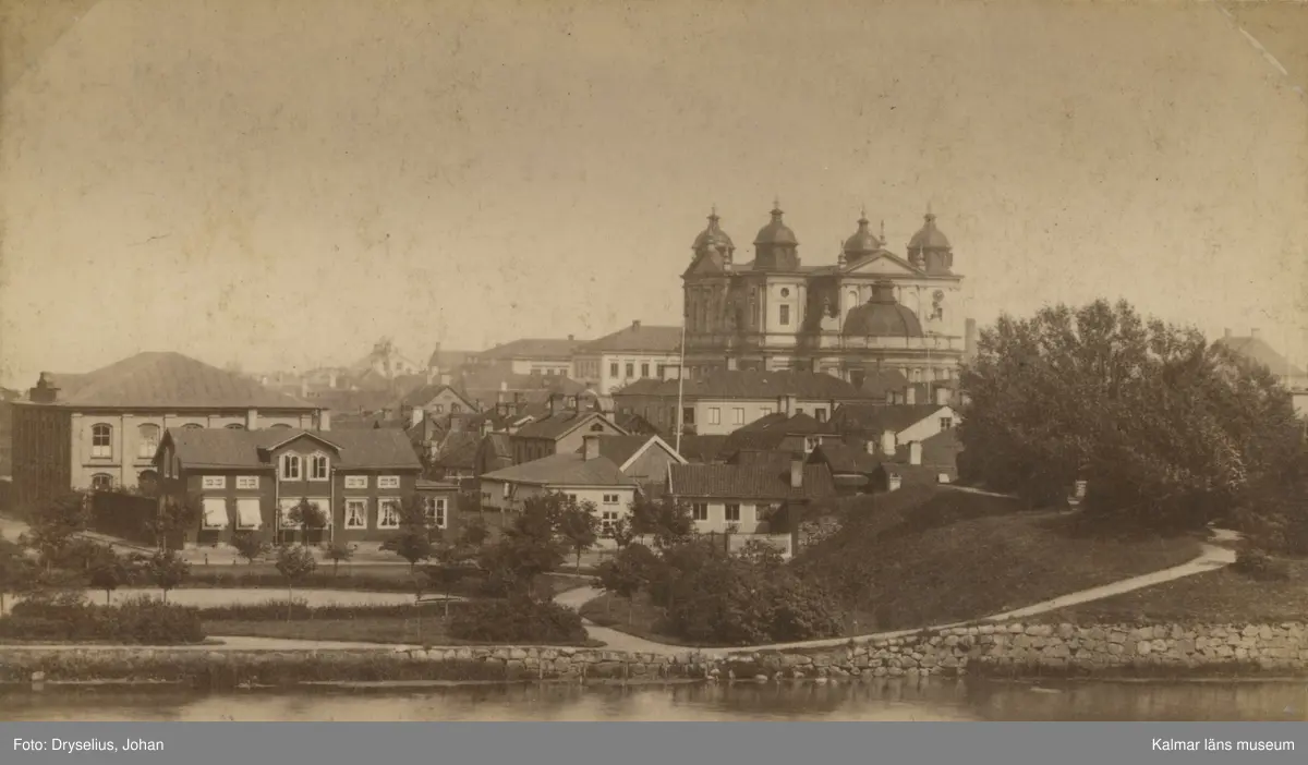 Vy över Kalmar med Systraströmmen och domkyrkan i bakgrunden.