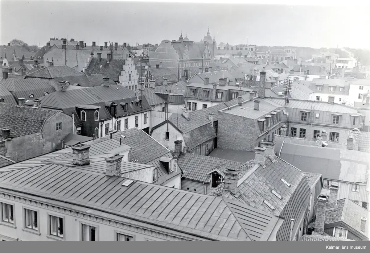Kvarnholmen från Kalmar domkyrka mot sydost. Cerstenska huset och Handelsbanken kan identifieras.