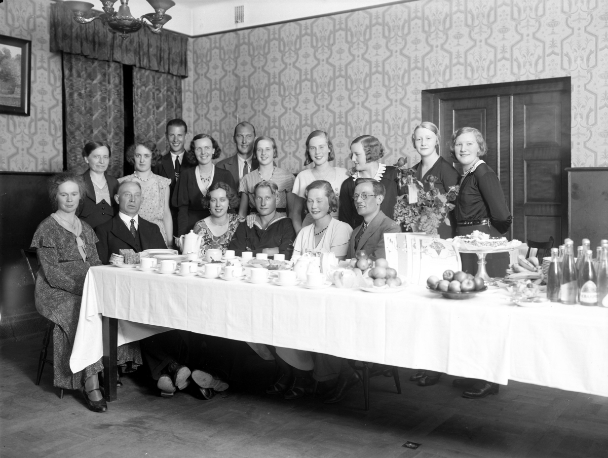 Gruppbild vid ett kaffebord. Enligt Walter Olsons journal är bilden beställd av fröken Thua Nyström ifrån Husållsskolan Anita.