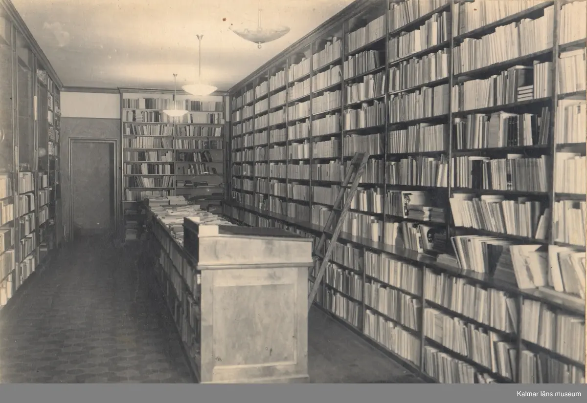 Hyllinredning av stål i Appeltoffts Bokhandel Kalmar. Utförd av E. A. Rosengrens, Göteborg.