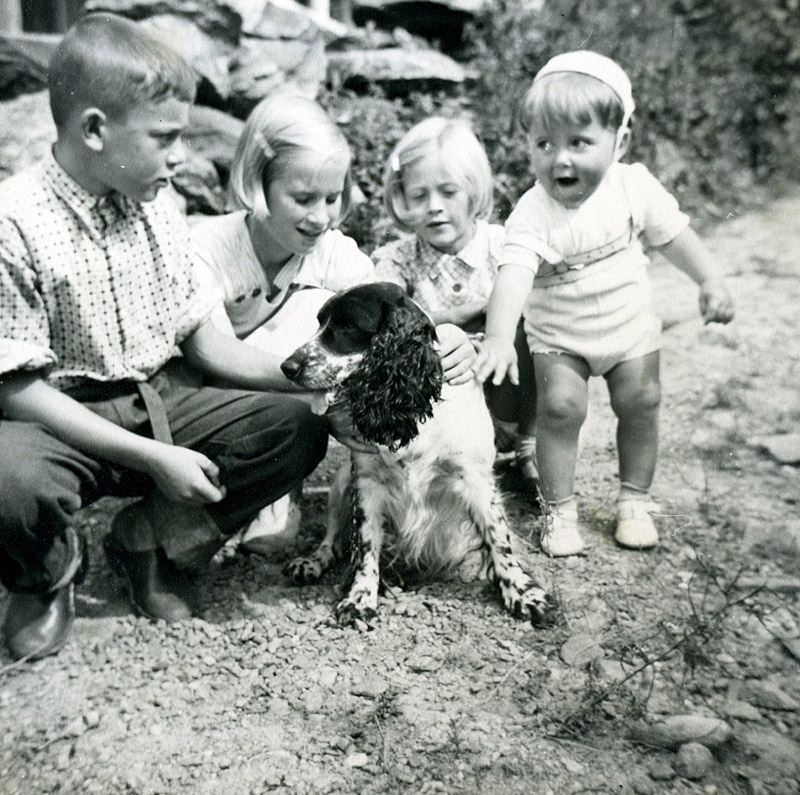 Fyra barn som klappar en hund.