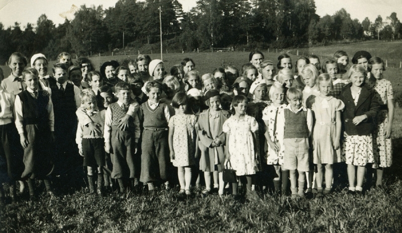Ett fyrtiotal barm och vuxna som står på ett gärde, med en skogsdunge i bakgrunden.