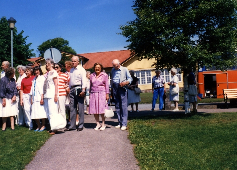 Titel: Röda Korset bussresa till Skåne 1989. Fr.v.: Allan Johansson, Torrekulla ? Margit Johansson, Torrekulla Bodil Amberntsson, Stretered Ann-Marie Stomvall, Risås backe Maj Werner, Livered Amy Högström Ingegärd Lundell Alve Brandin Astrin Linnerhag Agnar Linnerhag