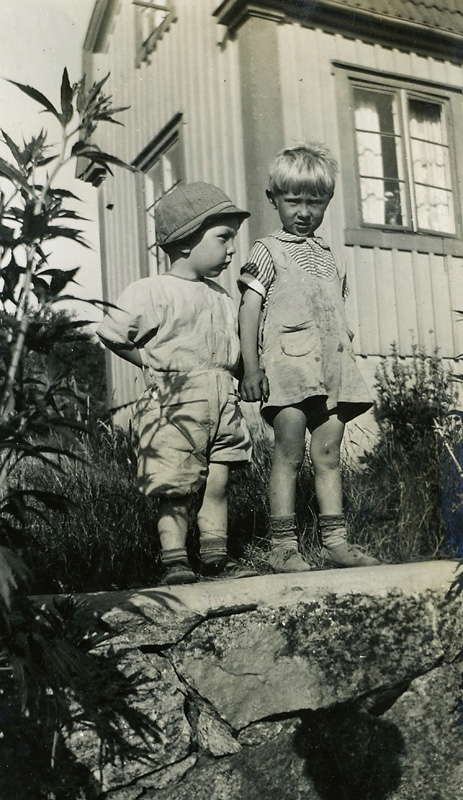 Två barn står ute i trädgården vid huset.