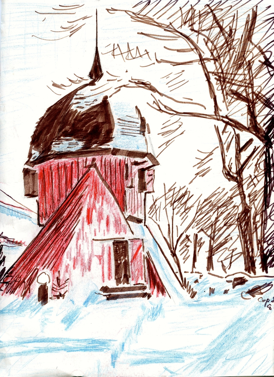 Kållered kyrkas klockstapel i vinterskrud, okänt årtal. Tecknad av Gustaf Lindman, kyrkoherde. Originalet finns i Hembygdsarkivets arkiv.