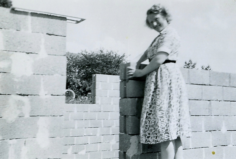 Långåker, Färåsvägen 45, 1954. Vid villabygget, Astrid Ericson f. 1930 d. 1993.