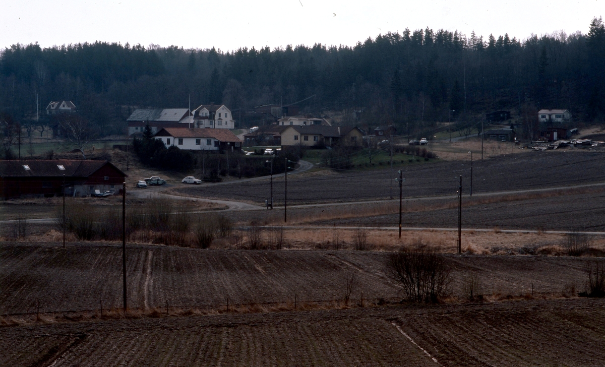 Vy över odlingsmark och Heljered Mellan- och Sörgårdar år 1978. Sandsjöbacka naturreservat ses i bakgrunden.