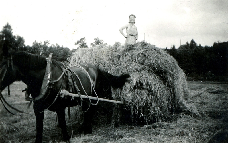 En kvinna står på en höskrinda full av hö och en häst är kopplad till vagnen.