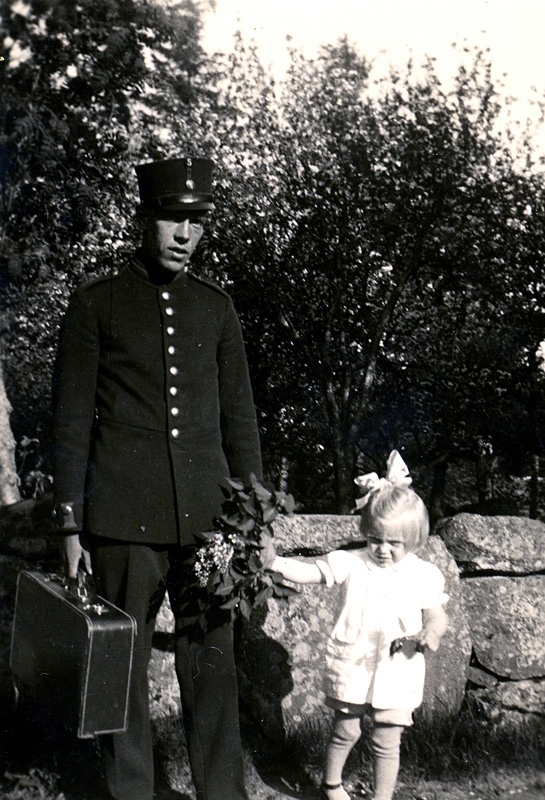Sporred 1:8 "Fredriks". Man med resväska, barn med blommor står vid stenmur.