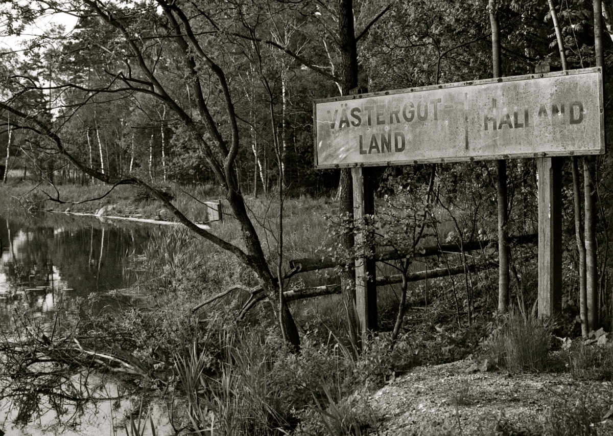 Vägskylten "Västergötland / Halland" som visar gränsen mellan Kållered - Lindome år 1986. Skog och natur ses i omgivningen och till vänster ligger en damm.
