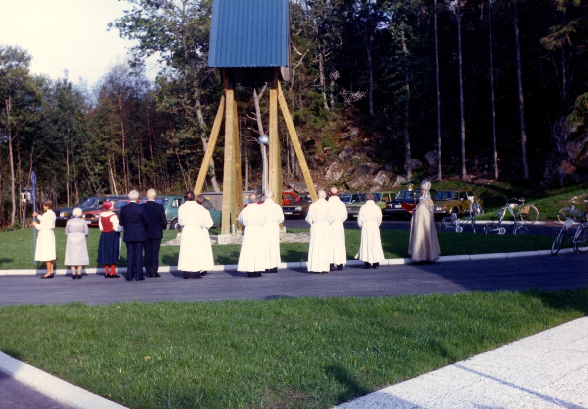 Invigning av Apelgårdens kyrka, Svenska kyrkan, 1982. Biskop Bertil Gärdtner, flera präster och övriga står framför klockstapeln.